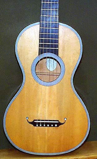 あと、以下の2つの写真のボディ内部に注目してください。ラベルの周囲からわかるようにスプルースであることに気付くはずです、外観はマホガニーのツキ板がどちらの楽器も貼ってあります。ようするにこれが2層構造なわけです。今回はマホガニーの広い板が入手できませんでしたので別の材料(メイプル)にします。なお19世紀当時はカリンとスプルース、メイプルとメイプルなんていう二層構造も存在しました。フレットは下の写真にならって象牙...は難しいので獣骨にします。