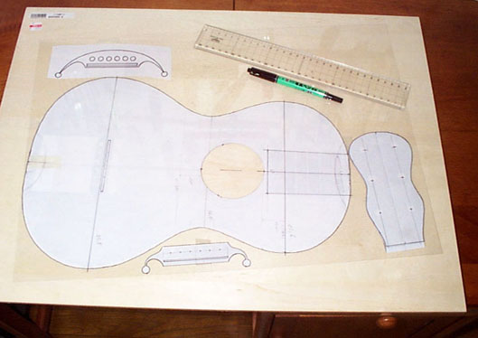 型は狂いの少ない素材で作るべきで、今回は1cm厚の合版をいくつか重ねて作成しました。そのためにはさきに準備した楽器の原寸図面のコピー(または青焼き)が必要です。コピー図面に描かれたボディラインに沿って切り抜きそれをテンプレートがわりに使って合版に鉛筆でけがいて糸のこで切り抜き、組み立てるという手順です。ついでにこの段階でヘッドやブリッジなども型紙を作っておきましょう。