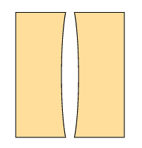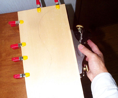 ペアの2枚を重ねてクランプし(大きいクランプがいいでしょう)接着面となる辺をカンナがけします。このとき切削面同志が直線になるのではなくわずかに弧を描いているようにします。あとで接着するときに両側からクランプをかけ圧着する際に密着しやすいからです。概略図は次の通り。