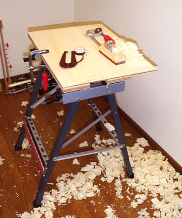 カンナがけはガッチリした作業台が好ましいのですが、無ければ以下のような組立式の作業台(なんらかで固定しないと作業は不安定)でもいいでしょう。写真のものはD.I.Yショップで3500円程度でした。私はこれとは別に木製の大きな作業台も持っていて現在はそちらをメインで使っています。