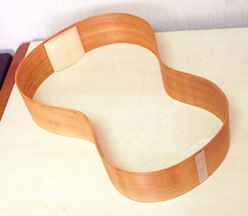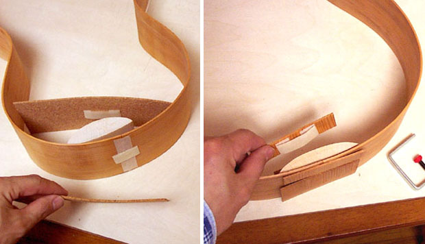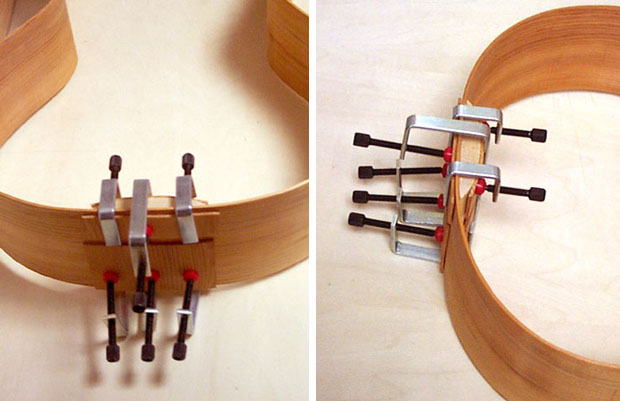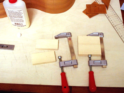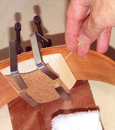 クランプをかけにくいので先にブロックをリブ(側面板)に接着して、あとから丸く削る方法もあります。
