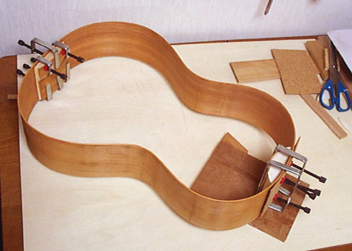 クランプはちょっと厄介です。なにしろ平面が無いので、私は小さなクランパを複数使ってみました。保護用にコルクの板などをはさんでおきます。