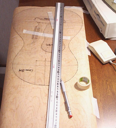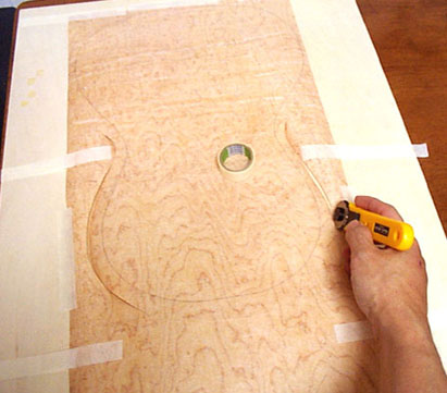次は裏板を作ります。まずはテンプレートを参考にやや大きめにツキ板をカットしておきます。Macの角形マウス(もち最高なのはMade in USA 白玉)で押さえながら作業するといいでしょう。