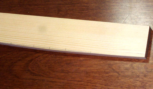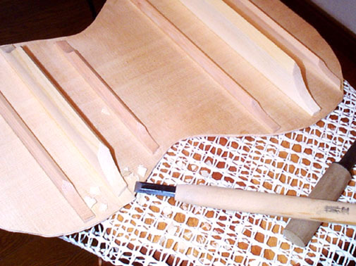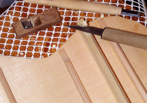 あとはバーの削り加工です。この楽器の裏板に接着するバーは先のとがった断面にしています。つまりリュートやバロックギターでよく見られるバー断面の形状にしてみたわけです。かなり太めで頑丈ですけど(笑)。