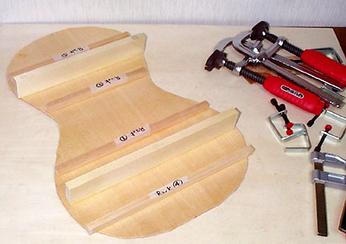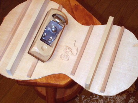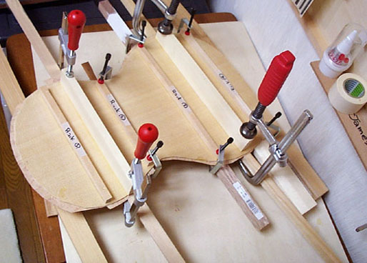 裏板は接着して乾かしておき、そこにバーをクランプして接着しますが、バーには表面板のバーと同様に若干のアーチをつけてあるのでかなり緊張した材料同志の接着です。