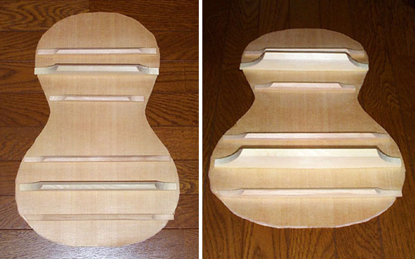 この作業を終えると表面板と裏板をいよいよボディに合体します。