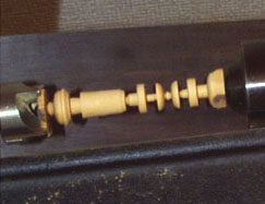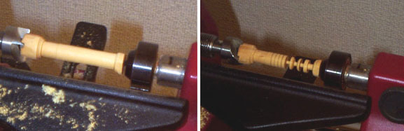 ボディがあるていど出来上がったらエンドピンを付けることにしましょう。木工旋盤でペグを作るようにこけし職人と化す鶴田であります。ついでにブリッジの両脇につける丸い2個のボタンも1本の木材から切り出すことにします。これはツゲの木です。