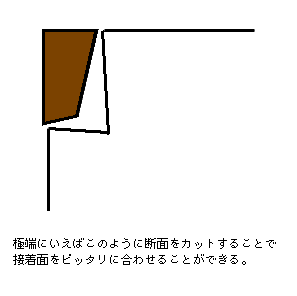 完全なL型(90度)の溝ではなく若干きつい角度(85度とか)になるように仕上げておきます。そうしないと接着面が汚くなります。この図は恐ろしく極端ですが....。