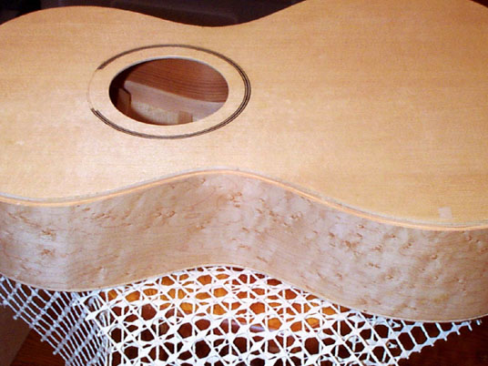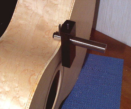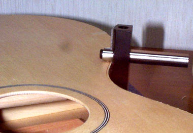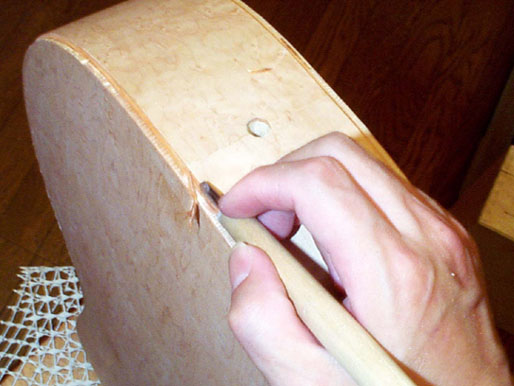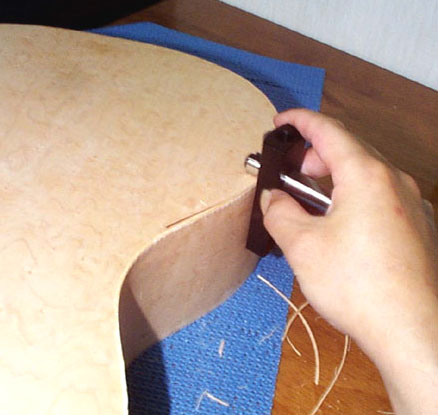 ビンディングとは表面板(あるいは裏板)と側面板とのコーナー部分に縁取りのごとく巻かれる細い木材で多くは黒檀やメイプルや象牙のような堅い材料が使われます。装飾と楽器の保護を兼ねます。スチール弦のギターやクラシックギターの製作家のなかにはルータでこの溝を切る人もいますが下の写真のように専用カッターを使う方法もあります。私はルータも持っていますがここではカッターで手作業にて切り出しています。