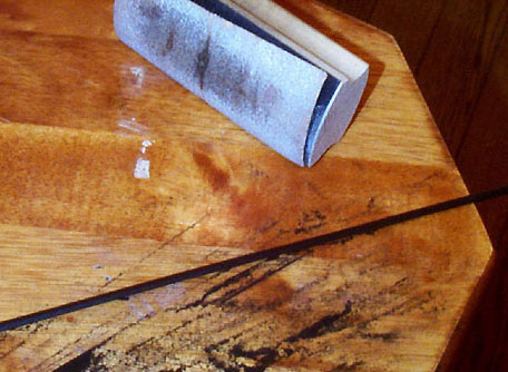 ビンディング材はカンナをかけたあとサンドペーパーとブロックを使ってコーナーを90度ではなくやや大きな角度にします。カンナでこの作業を行うこともあります。
