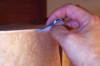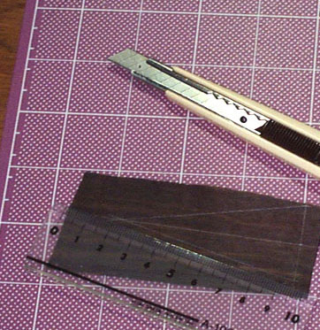 さきの続きでビンディングをボデイに接着する前にやっておくことがあります。それはエンドピン周辺の三角形の飾り板です。これは黒檀のベニヤを使いましたがやや厚いほうが接着時に反らないので好都合です。ここでは薄いものを使っています。カッターで切れます。