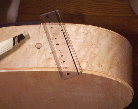 図面を参考にボディ側に鉛筆でマークしてカッターでまずはツキ板をカット。表面板と裏板を接着する前に行ってもよいでしょう。