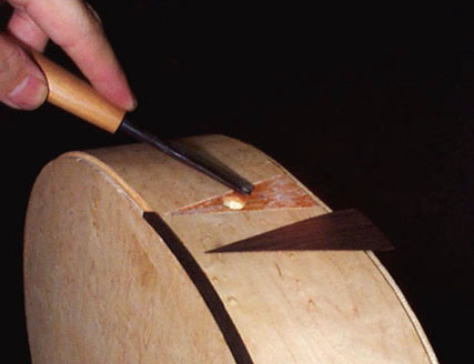 そして平ノミか彫刻刀で薄く剥がしていきます。そこにタイトボンドで三角の黒檀板を貼ります。デザインナイフ等でピッタリに合うように慎重にサイズを調整します。