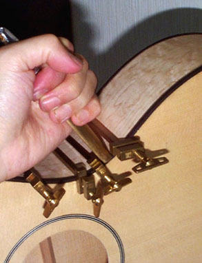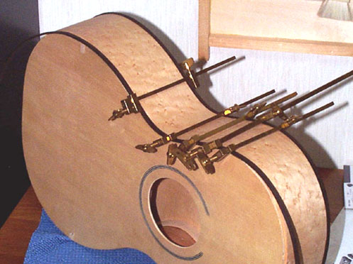 小さなハタガネがかけにくいところは表面板の接着で使った大型ハタガネで以下の写真のように固定します。カーボンクランプも使うことがあります。