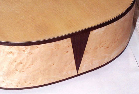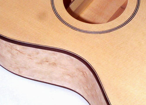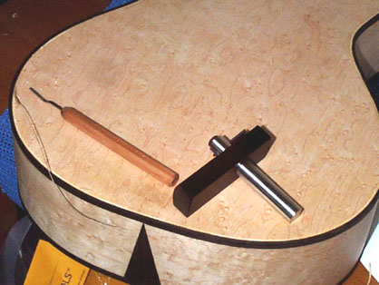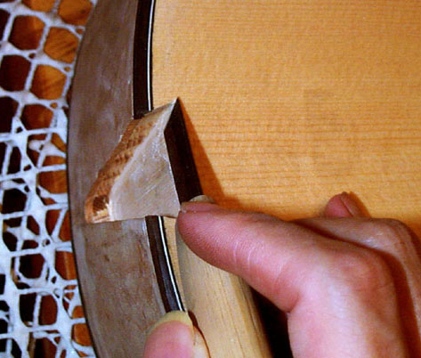 さきほどのビンディングの内側を専用カッターで切り込んで溝を作り、そこにパフリングとなる細い木材の帯を埋めていきますが、製作家によっては逆の手順で作業することもあります。このへんは鶴田流と考えて間違いありません、はい。私はこの方法に慣れてしまいました。