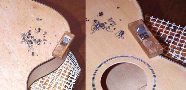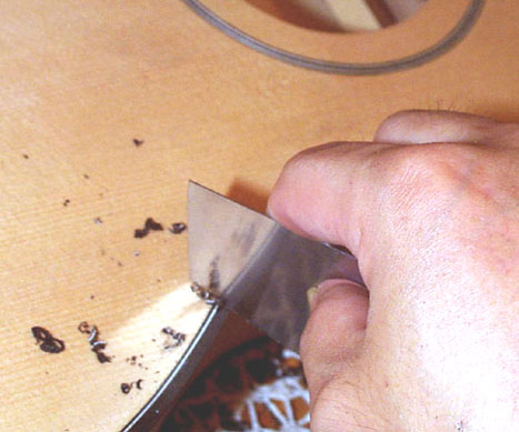ある程度までカンナで削ったら、今度はスクレーパで表面板とパフリングとビンディングの高さを揃えます。スクレーパはよく研いでおきましょう、そうすれば気持ちよく作業できます。この写真では片手で削っていますがギター本体を固定して両手で削ったほうが安定します。どうしても一人で作って、一人で写真を撮っているので片手の写真が多いです。一人で作って、一人で写真を撮って、一人でメモをとって、一人でブブブツ言って、一人で失敗して、一人で考え直して、一人で修正して、一人で納得しているという変な世界です(笑)。