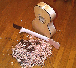 さんざん切りクズを出しつつネックとボディができてきました。気分もなんとなくワクワクしてきます。でも決して先を急いであわててはいけません。私が過去に作った楽器で反省すべき点ははどうしても形が見えてくると急いで作業してしまうことです。今後の鶴田は急がずあわてずスローハンドでまいります、フッフッフッフッフッ.......(意味不明)。