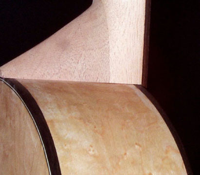 先に作っておいたネックを仮に組んでみます。まだ接着はしません。ここで若干のネックの角度を調整できますし、同時に接着面をピッタリに合わせる工夫もせねばなりません。私がギター作りでいちばん難しいと考えている部分です。