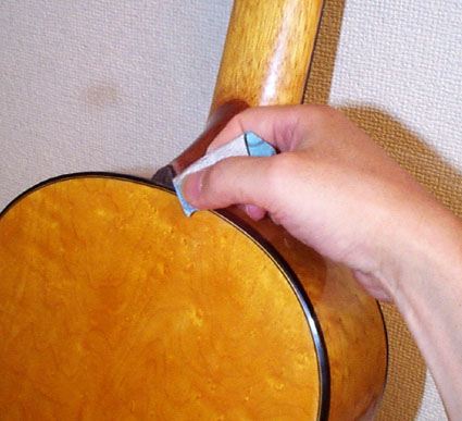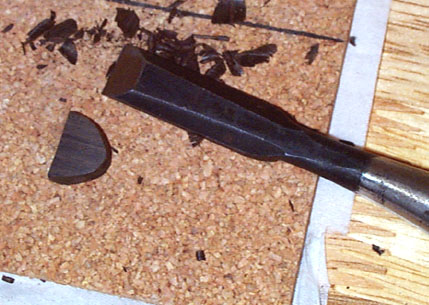 黒檀は堅いのでサンディングして形状をととのえるには時間がかかりますから、ある程度はノミで落とし、最後にサンドペーパで仕上げることにします。このような小さなパーツの加工はケガをしやすいので両面テープで板に固定して作業するといいでしょう。ボディに仮組みしながら削って合わせます。