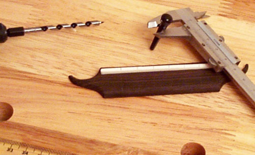 ブリッジに弦を固定するピンを差しますが、径を合わせて穴を空けねばなりません。このとき小さめの穴を空けてから最後にリーマでピッタリに合わせます。まずはサドルに弦の位置を鉛筆でマークしてピンの軸径をノギスで計ります。たいていは直径4.5mm程度を使います。