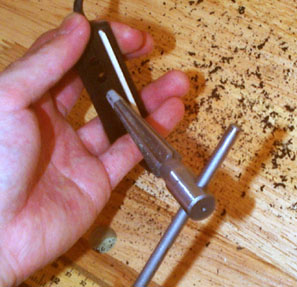ブリッジに穴を空けるには私は木工用ハンドビットを使います。これもヘッドのペグ穴加工と同様に必ず両側から穴を空けます、そうすればバリが出にくいです。ピン穴は以下の写真のように傾きを与えないと弦を張ったときにすっ飛んでいく?可能性があります。じつはワタクシ、某ショップで19世紀のオリジナル楽器のピンが飛んでいくのを見たことがあります。写真に写っている長いテーパのついたビットはバリ取り用です、今回は使っていません。手で固定するよりもバイスで挟んだほうが安全ですが、角度を常に確認しながらの作業なので工夫が必要ですね。
