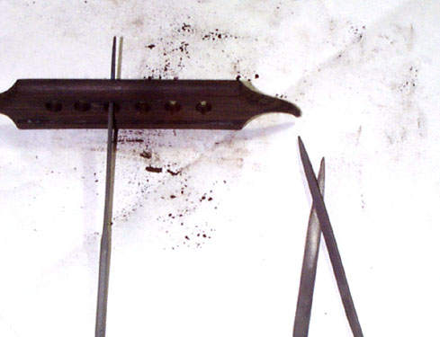 そして弦をひっかけておくための溝を掘ります。専用ノコで切って精密ヤスリかラインヤスリで細部を仕上げます。19世紀のギターのなかにはこの溝を切ってないものも多いです。
