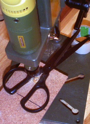 ブリッジの残りの部分は両脇のボタン(装飾)です。本来は黒檀を使います。ここで正確に加工するための治具を作ろうかとも思ったのですが量産するわけでもないので慎重にハサミで固定しちゃってルータで穴を空けました。みなさんはマネすることはありません(笑)。ミニバイスがあればそれを使うべきです。