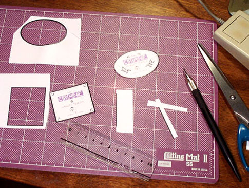 次の写真はイラストレータVer8.0で描いてALPS社のMD5000で印刷したものです。カラーですが、じつはちょっと秘密があってわざわざ2回の重ね印刷をやっています。四角いラベルはリュートに貼りました。楕円のものはラコートの楕円ラベルにならってこのギターに貼ります。12年使ってきた角形マウス(MacintoshSE)のボタンには磨耗の跡が.......。