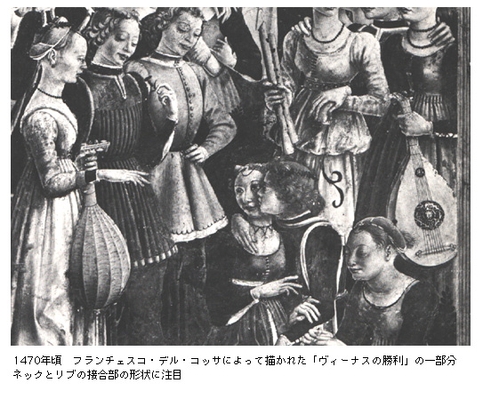 以下の写真をもとに楽器を製作した例が海外のホームページに写真で掲載されているのを見かけたことがあります。こちらもネックとボディの接続部にタマネギのような反りの形状が見られます。よくみると複弦ではなく単弦に見えますが本来は7本のペグを持つ4コース複弦の楽器なのかもしれません。リュートは基本的に複弦で、単弦は例外的なものとされています。絵画や博物館の楽器には弦の幅 を一様にしてしまっているものも多く見られ、絵に描かれているからといってその形態を鵜呑みにはできません。あ、下の写真の中央の女性はなんだかイヤがってませんか? 気のせい?