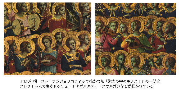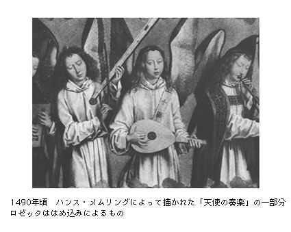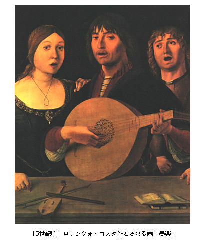 以下の絵画のリュートも単弦の6本で描かれています。この時代のリュートの多くは真円でボディを設計したらしく、ロゼッタ(ギターでいうサウンドホール)の位置や大きさものちのリュートとは異なることに気付くでしょう。G.A.L(No.12/1987)の季刊誌にこの絵画と同時代の楽器に関するファクシミリや記述があります。