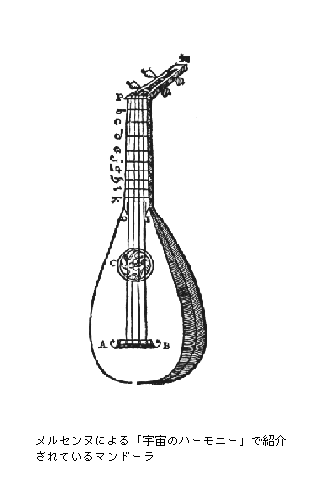 マンドーラは特に重要な楽器で少なくともその原型は10世紀以前にまでさかのぼるといわれます。小型リュートを指すマンドール・リューテ(mandore luthee)からゆえんする名称で、イタリア綴りのmandoraを基本としてフランス綴りのmandoreなどと表記されていますがラテン語名でテストゥード・ミノール(Testudo minor)と表記されることもあったようです。トゥリシェによると元々はマンドーラにフレットは無くのちに9つのガットフレットが付けられたとのことです。弦もメルセンヌの「宇宙のハーモニー」の挿し絵に見られるように4本の単弦が当初は基本とされていたようですが、のちにリュート族楽器の普及に伴い5番目や6番目の弦が追加されたと見られています。メルセンヌが4本の単弦を持つ楽器をマンドーラとして描いたのに対して、プレトリウスは5コースの楽器(c,g,c',g',c'' 及び c,f,c',f',c'')をマンドーラとして描いとしているようです。16世紀頃からボディは次第に細くなっていったようで楽器もいくつか残されており特に17世紀のイタリアでは広く普及していた弦楽器のひとつといえます。17世紀初頭にはさらに低い音域のそれが作られたために従来のマンドーラはあらためて「マンドリーノ(ちいさなマンドーラ)」と名前が付けられたという説があります。私も自分で説明を書いていて混乱します(笑)。