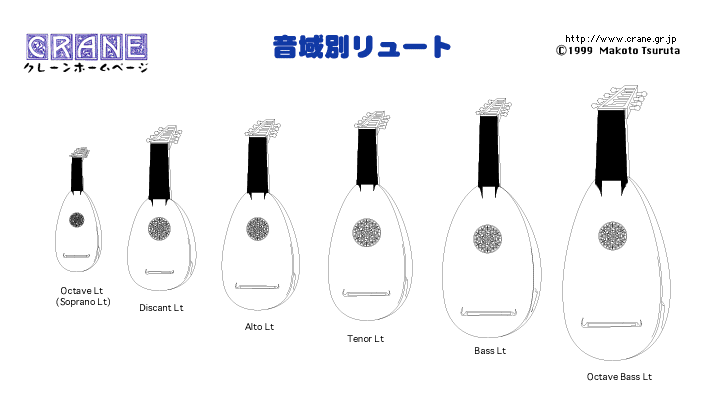 リュート製作のおおまかな歴史やスタイルはご理解いただけましたか? できれば弦長や弦の増加及びボディ形状の変遷を詳しく記したいところですがそんなことをやっていたら22世紀がやってきてしまいますから後に譲るとして、なるべく最低限知っておいたほうがいいことを優先して説明していきましょう。ここではひとまずリュートのサイズとかかわりの深い「音域別の楽器」について紹介します。また、今回は小型ボウルバック楽器を製作するわけですからそれによく似た楽器などについても調べてみることにします。
