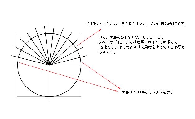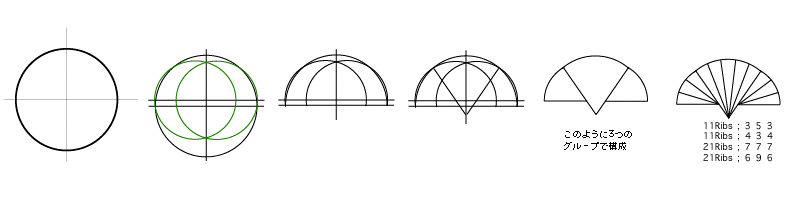 ボウルの半円を3つの円で構成すると考えておおむね3つのグループでリブの構成を考えます。例えば21枚のリブであれば両脇のグループは6枚づつで中央のグループは9枚といったぐあいです。