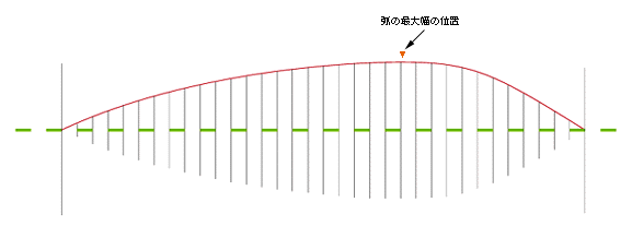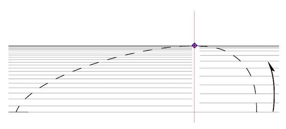 3. 弧の最大高さの点に印をつけておきます。そして弧の1cmおきのマークに従って中央線を境に左右に水平線を引きます。JR中央線は毎年春になると人身事故が多いので通勤に中央線を使う私としてはひっじょ〜〜に困ってしまいます。