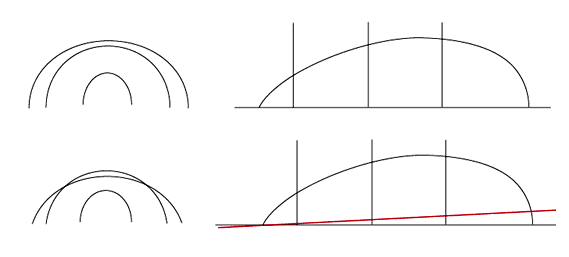 実際には上記説明の 1. のようなきれいな半円でリブが作られているわけではなく次の右図のようにやや押しつぶしたような断面になります。マンドリーノではほぼ半円なものもありますが大型のリュートのなかにはかなりボウルの浅いものもあり半円で作ってしまうとやたら分厚くなって弾きづらいだけでなくカッコワルイスタイルになってしまいます。ちなみにウードなどは大型であってもほぼ半円(半球に近い)でボウルは作られています。
