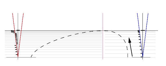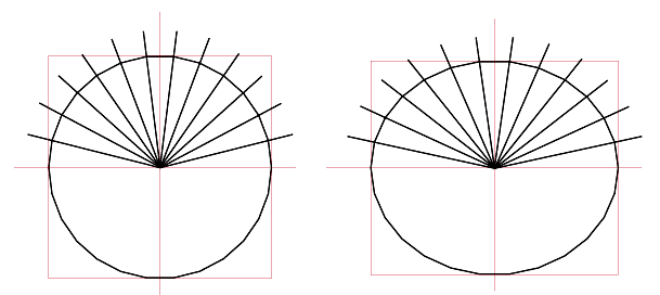 4. 次に 1. で決めたリブの角度をこの図に垂直に重ねて描きます(下図)。水平線と重なる角度線の内側の幅を定規で計ります。イラストレータをお使いであればツールパレットの定規と「情報」パレットでクリックするだけで自動的に表示されます。もう片方も同様です。次図の赤い角度線が左側で青い角度線が右側です。弧の最大高さにおける角度線の内側の幅はこの楽器の場合は 1.775cm となりました。そうです、あなたが準備するリブ用の木材のサイズはさきの 2. とこの 4. の結果から算出されることになります。