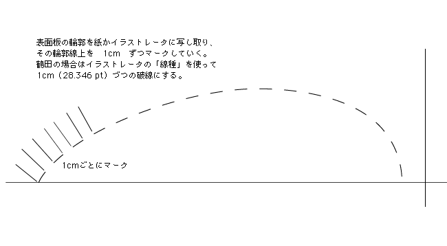 2. 表面板の輪郭線の片側半分をトレースして紙に書き写します。そして適当に水平線と垂直線を補助線として描いておけば作業がしやすいです。私の場合はイラストレータで横に寝かせて配置します。イラストレータでは弧を線種の設定で破線(1cm:1cm)にすればあっというまです。ちなみに1cm =28.346 pt です。この時点でリブの全長がわかりますね。