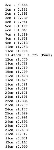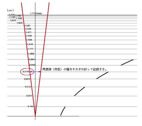 5. さて、弧の長さは右から左へとたどることにします。順番に1cmごとの角度線内の幅を並べてみましょう。つまり青色の角度線内の幅は 0cm位置で幅0cm 次に 1cm位置で幅0.245cm 次に 2cm位置で幅0.492cm 次に 3cm位置で幅0.730cm .......といった具合です。これを弧の全域にわたるまで調べます。