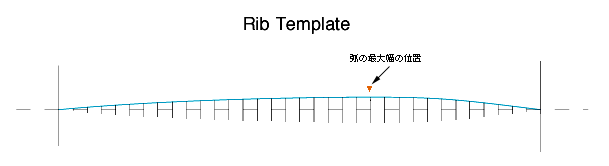 6. ということでリブの長さは約33cm、リブの最大幅は1.775cmとなりました。 5. の数値表をもとに方眼紙などへ転記していけばリブのテンプレートのできあがりです!