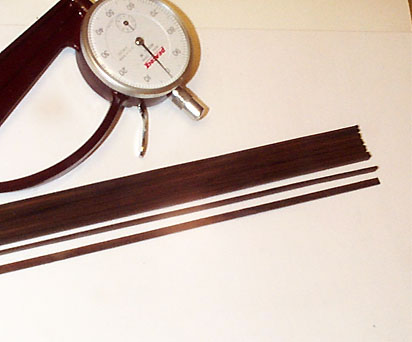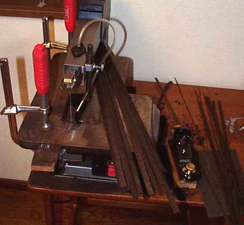 さて、糸のこを使う工程ですから、ついでにリブの間に挟むスペーサも切り出しておきましょう。長い板材から糸のこで切っていきます。ビンディングの線材もこの段階で同様に加工しておいてもいいでしょう(注:写真より実際はもっと細いです)。
