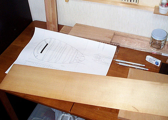 というわけで表面板の削りあがり。表面板に2枚を使う場合のはぎあわせ(接着方法)は19世紀ギター製作コーナーを参考にしてください。モダンなクラシックギターの表面板は大きくて材料調達においてもそのサイズのスプルース材を確保するのがたいへんらしいのですが19世紀ギターやバロックギター、あるいはリュートはそれより幅も高さも小さなサイズで済みます。どうです、ちょっとエコだと思いません? 海外の木材屋さんでも小さめのスプルースはけっこう格安で入手できたりします。