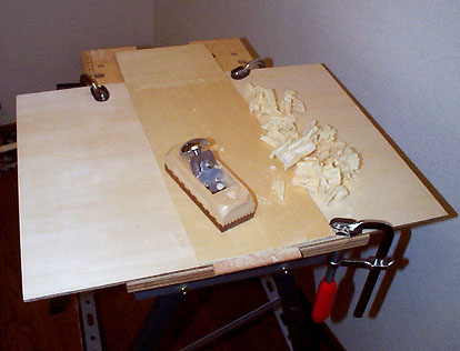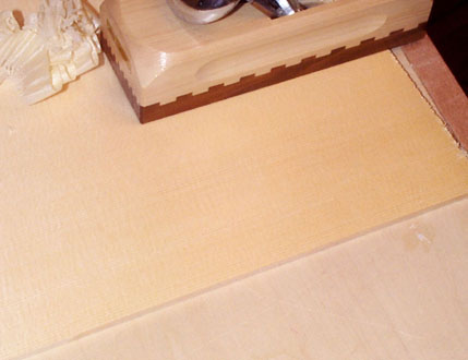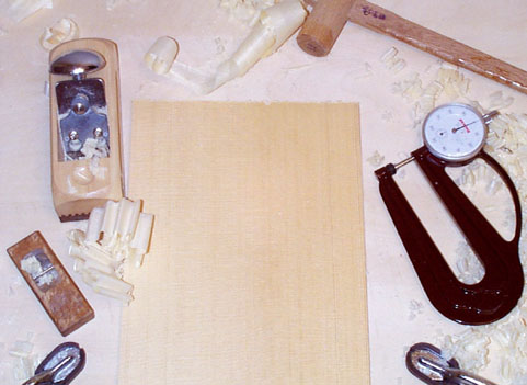 チックネスゲージは必需品です。削りにくいときは台のはじっこに薄い板片を接着して、そこに表面板をひっかけておいてカンナをかければ作業が楽です。