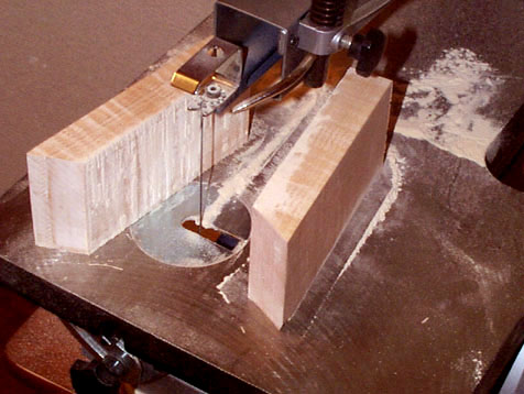 本来ならバンドソーのバンと置いてソ〜〜〜っと切れば楽ですが、私は糸ノコ台しか持っていないのでこうやってジワリジワリと時間をかけて加工します。