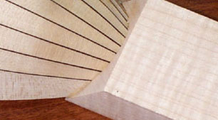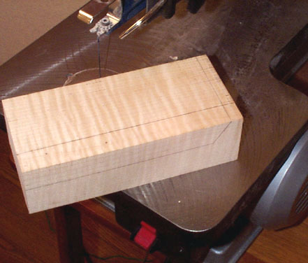 ネックの材料ですが、バロックリュートでは最初に説明したようにスプルースに黒檀のツキ板を貼ることがありますがこの楽器の場合はメイプルのムク材です。指板接着面に対して柾目になるように木目をとります(ヴァイオリンは板目にとる)。まずは図面を参考におおむねの長さにけがいてカットします。