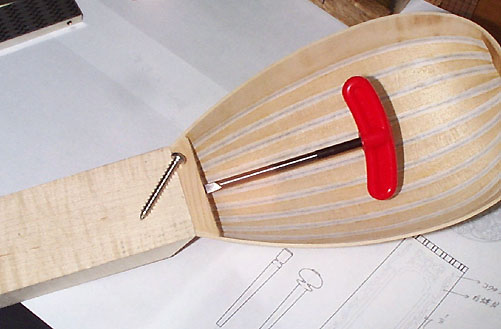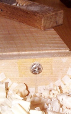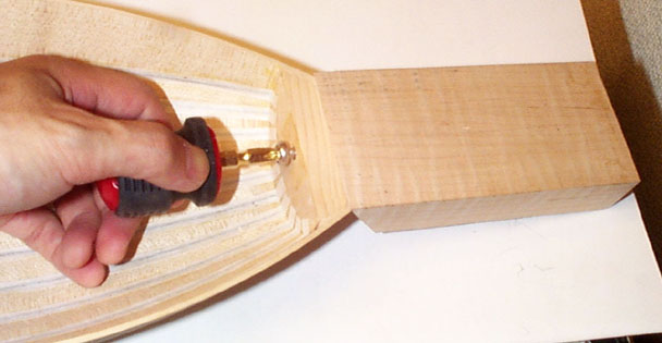 まあ、この下穴も本格的に接着したあとで空けてもいいのです.....。ピンは本来なら木ネジではなくネジ山の切ってないストレートなものを加熱して打ち込むらしいのですがここは文明の利器というか木ネジを使うことにします。