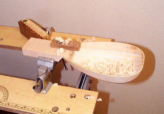 接着する前にボディとネックの傾斜接触面がピッタリ合うようにノミで合わせておきます。