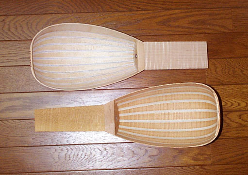 え〜〜〜、じつは、実話、週間実話、じつは、暴偉大な....おっと、亡偉大な....、あ、いや、乏、おっと......某偉大なリュート製作家からマンドリーノのつくりかけを頂きまして(いい師匠だなぁ〜〜)、それをここで並べてみましょう。写真の上に置かれているのが私の作った1735年 G.フォッタネッリのモデル、写真下が師匠のストラディバリモデルであります。弦調は310mmと320mmでまあほぼ同じですがフォルムがかなり異なりますね。マンドリーノにもまるっこい形状のものはありますがストラディバリは細くて縦長のものが多いようです。