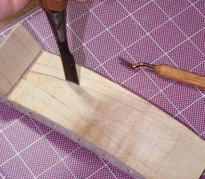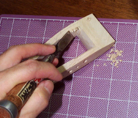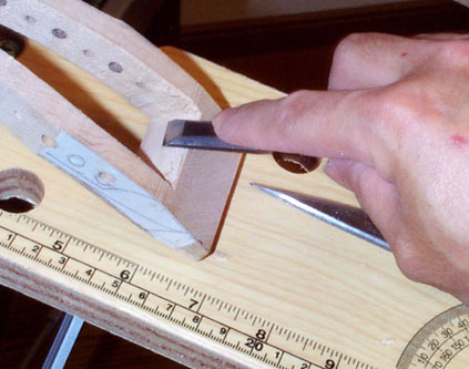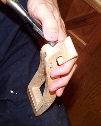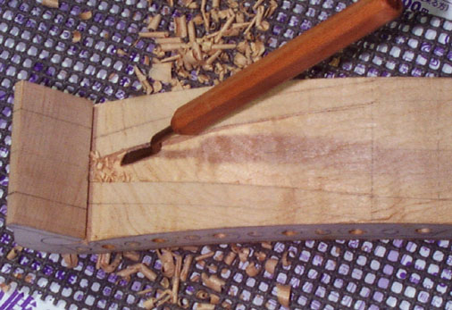エイコラ、エイコラと彫っていけばいいのですが宮大工さんなどがよく使う差入れ用のノミを使うほうがいいでしょう。但しペグボックスの先端部はかなり狭くなっているのでこのような小型の細工ノミも併用したほうがいいかもしれません。彫り込んで裏を残すにはこうやっていけばいいわけです。