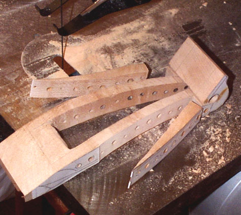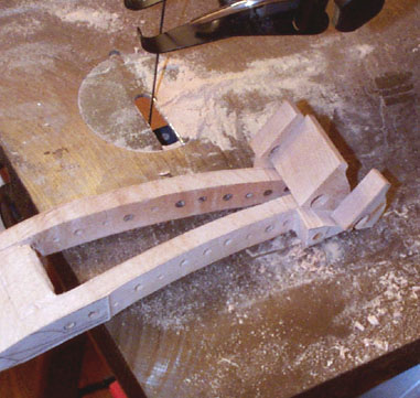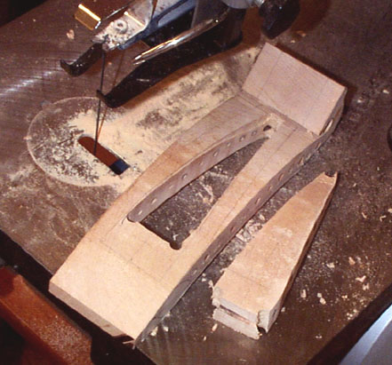 糸のこでの切り抜き作業は作業の安定を考慮して両サイドの加工の前に行います(そうしないと不安定)。切り抜いた木片はハシゴに使うことも可能です。