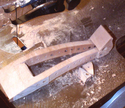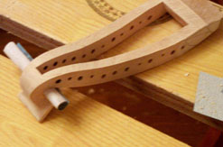 さて、リュート族のペグボックス加工には大別して3つのスタイルがあります。以下の写真のように彫り込んで裏を残す(つまり木彫りの箱船みたいな)もの。そして貫通させて向こうが見えてしまう方法、そして横・裏板を別途パーツとして切っておいたものを組み立てる方法の3つです。
